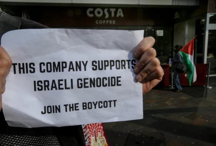 可口可乐旗下的 Costa Coffee 咖啡店外,抗议者举着写有“这家公司支持以色列种族灭绝,加入抵制”的标语牌